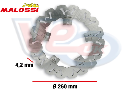The Newest Generation of Disk Brakes. Light, non corrosive, non-warping, antistress. Studied for prolonged use in all weather conditions and types of terrain. The WHOOP DISCS were exposed to numerous tests during competitions, giving Malossi technicians an opportunity to fine-tune the disk brakes for various vehicles. The WHOOP DISC paired with Malossi BRAKE PADS guarantee a progressive and secure braking even under extreme conditions. Technical features Stainless steel disk, laser cut, hardened and surface machined. Profile designed using CAD to insure complete scraping of the brake pad, the elimination of brake dust, and the removal of water and mud during braking. Surface area doubled to lower the disk s working temperature.Malossi number 6212352, now 6218945B 260mm OD, 4.2mm Thick, 5 bolt mounting