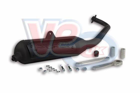 The Malossi Wild Lion exhaust for 50cc scooters, a quality low cost exhaust, that is ideal for a standard replacement, still nice and quiet, yet can give a nice improvement in performance if desired, finished in heat resistant black epoxy and with the heat shield carrying the Malossi lion logo.