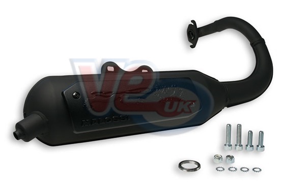 The Malossi Wild Lion exhaust for 50cc scooters, a quality low cost exhaust, that is ideal for a standard replacement, still nice and quiet, yet can give a nice improvement in performance if desired, finished in heat resistant black epoxy and with the heat shield carrying the Malossi lion logo.