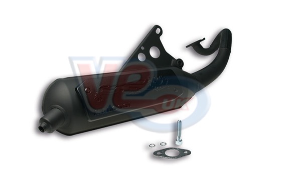 The Malossi Wild Lion exhaust for 50cc scooters, a quality low cost exhaust, that is ideal for a standard replacement, still nice and quiet, yet can give a nice improvement in performance if desired, finished in heat resistant black epoxy and with the heat shield carrying the Malossi lion logo.