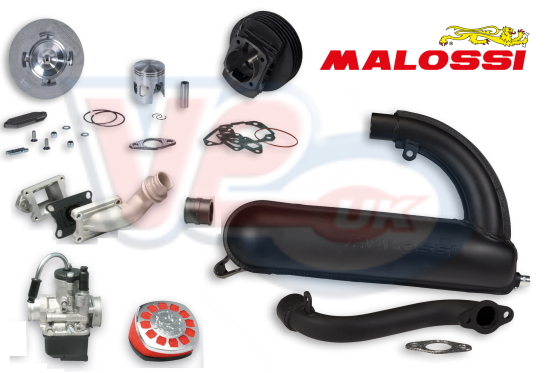 The Malossi Touring bundle, comes with the Mark 4 Malossi Iron 135cc Cylinder kit VM317681, the Malossi Power Classic Exhaust VM327868 and the Malossi 25mm Reed Valve carb kit VM165907. If fitting this to a 50-90-100 motor, Primary gear kit VE11115 is recommended, and if fitting this to a 50cc motor a 125cc 51mm stroke crankshaft is needed.